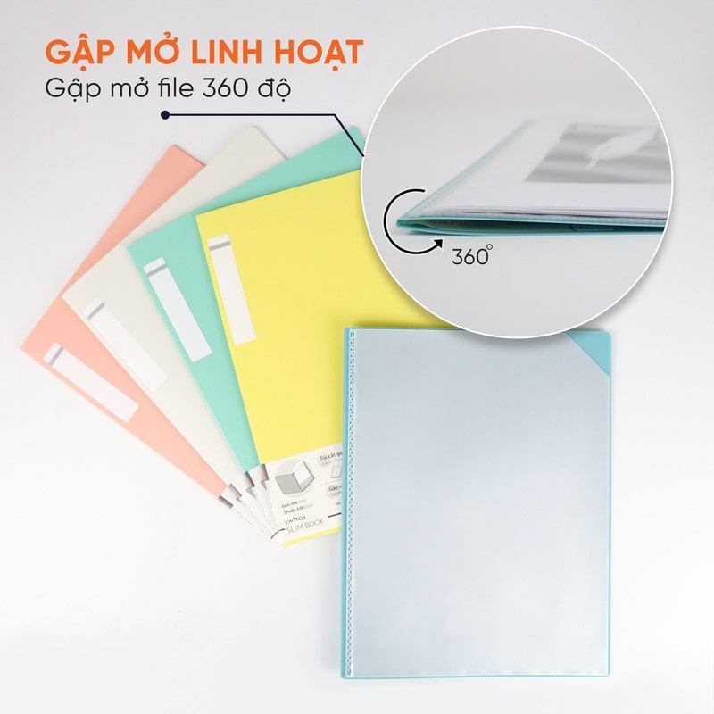 - Bìa lá 10 túi Slim Book Switch AO+ là sản phẩm được thiết kế tối ưu công năng nhỏ gọn, tiện dụng. Bìa có thể gập 360 độ dễ dàng cầm bằng một tay; túi được thiết kế cắt góc giúp lấy tài liệu dễ dàng nhanh chóng.