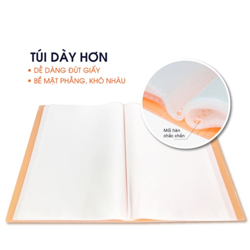 - Sản phẩm phù hợp với công việc văn phòng, học tập giúp đựng hồ sơ, phù hợp với khổ giấy A4. giúp bạn bảo quản giấy tờ sạch sẽ, tránh nhàu, sắp xếp tài liệu một cách dễ dàng và khoa học hơn. Được sản xuất với hai loại kích thước Bìa 20 lá, Bìa 40 lá phù hợp với nhu cầu của bạn.
