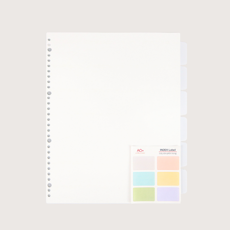 - Bìa Phân Trang AO+ có thể sử dụng để phân loại tài liệu trong bìa còng, tab phân trang giữa các môn học, chương học,... giúp bạn tiết kiệm thời gian tìm kiếm cũng như dễ dàng quản lý, phân loại. Sản phẩm được làm từ nhựa PP cao cấp bao gồm 6 Tab phân trang và giấy dán chỉ mục cho từng tab.